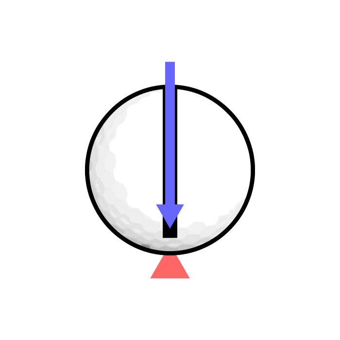 We’ve discussed what happens when the line of compression passes through the centre of the ball. In reality, this doesn’t happen, except potentially when using a putter. Because all other clubs are lofted, leaning backwards, the clubface will first come into contact below the ball’s equator. The more loft a club has, the further the clubface leans back, the lower on the ball this impact point is.(6) This means our line of compression no longer passes though the centre of the ball, but below it. It’s this off centre force that produces spin on the ball. The direction of the spin will be backwards because the line of compression is below the equator. In order to produce a forward spin, topspin, the line of compression would have to be above the ball’s equator. This is otherwise known as a topped shot, where the bladed edge of the club hits the ball above its equator. The further from the centre of the ball the line of compression is, the more spin will be imparted on it. That is to say a 3 iron, with its impact point relatively close to the ball’s equator will impart less backspin on the ball than a 60 degree wedge, with its relatively low impact point. It’s this difference in impact point location, the higher and lower lines of compression, which affect the amount of backspin, not so much the ball rolling off a lofted club.(7) It’s this amount of backspin which affects how high the ball flies.